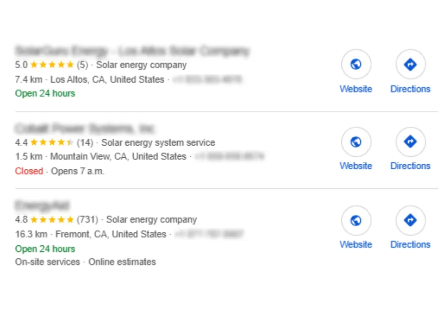 The Google Map 3-Pack is essential for local solar businesses. It shows your business location, customer ratings, and contact information right on the map, making it easy for potential clients to find you.